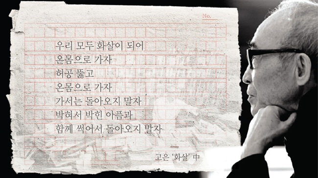 좌파 시인 고은과 그의 시. [사진=SBS뉴스(2016.12.28.)] 좌파 시인의 시를 읽다 보면 이상할 정도로 비슷한 느낌을 받는다.