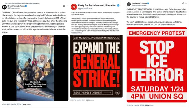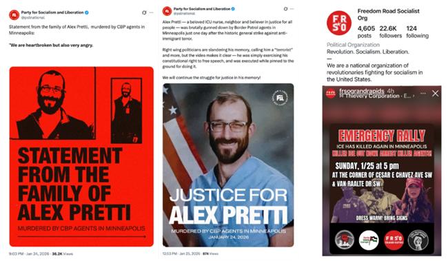 사회주의 단체들은 미니애폴리스에서 알렉스 프레티 총격 사망 사건이 발생하자 미 연방을 악마화하기 위한 행동에 빠르게 착수했다. [브레이크스루 뉴스=X, 사회주의 해방당=X, 프리덤 로드 사회주의 조직=X]