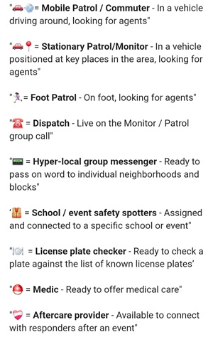 데이터베이스 가이드 “이웃 또는 지역 순찰·감시를 위한 모범 사례 가이드: 612”에는 다음과 같은 이모지와 행동 강령이 포함되어 있었다.