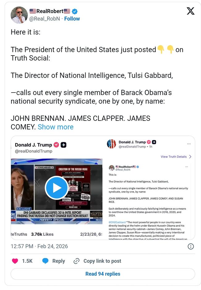 해당 영상에서 개버드 국장은 "우리나라에서 가장 강력한 사람들은 버락 후세인 오바마와 그의 국가 안보 내각 고위 간보들(제임스 코미, 존 브레넌, 제임스 클래퍼, 수잔 라이스)의 지휘 아래 직접적으로 주도권을 쥐고 있었으며, 본질적으로 2016년 11월 도널드 트럼프에게 힐러리 클린턴을 물리치고 역사적인 승리를 안겨준 미국 국민의 의지를 전복시키려는 목적으로 이 조작되고 정치화된 정보를 만들어내기로 매우 의도적인 결정을 내렸다"고 말했다.