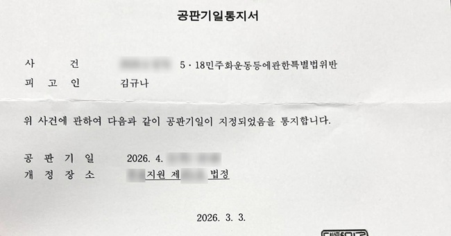 김규나 작가에게 날아온 공판기일 통지서. 공판이 오는 4월로 잡혔다. [사진=김규나 페이스북]