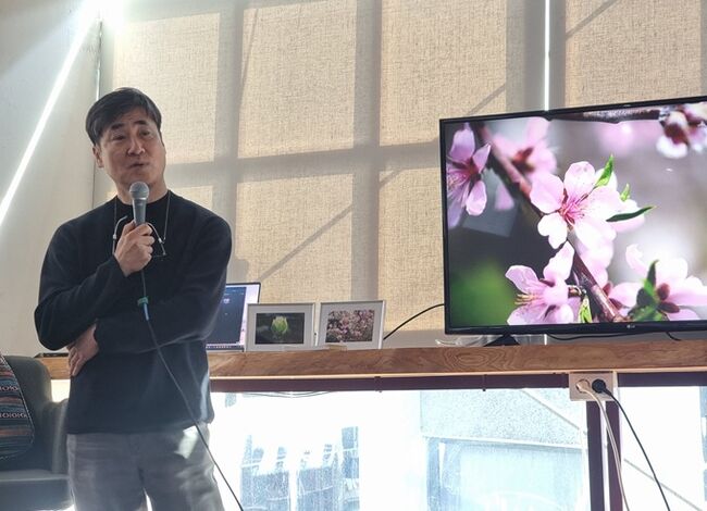 윤상구 사진작가가 사진 설명을 하고 있다.