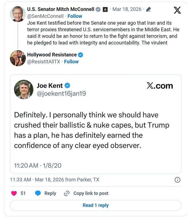 미치 맥코넬(Mitch McConnell,공화·켄터키) 상원의원은 17일(화) 엑스에 "조 켄트는 1년 전 상원 청문회에서 이란과 그 테러 대리 세력이 중동에서 미군을 위협하고 있다고 증언했다"면서 "그는 테러와의 전쟁에 복귀하는 것을 영광으로 생각하며, 청렴하고 책임감 있는 자세로 임무를 수행하겠다고 다짐했다"고 지적했다.
