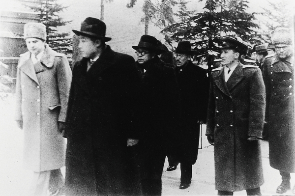 1949년 3월 북한 수상 김일성(가운데), 부수상 겸 외무상 박헌영(김일성 뒤), 부수상 홍명희 등 북한 정부 대표단이 스탈린을 만나기 위해 소련 모스크바 크렘린궁에 들어서고 있다.