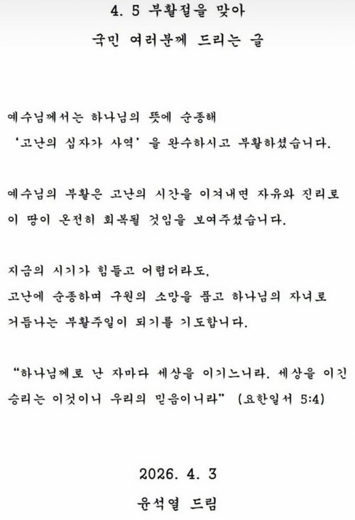 배의철 변호사는 “이번 부활절에 윤 대통령님 말씀으로 힘을 얻고 싶다는 국민과 청년들의 요청이 많았다”면서 “이를 접견에서 말씀드렸고 늘 국민을 걱정하며 기도하는 윤 대통령님께서 4·5 부활절을 맞아 아래와 같이 국민 여러분께 드리는 메시지를 주셨다”고 설명했다.