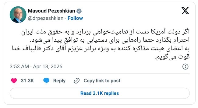 앞서 12일(일) 이란의 마수드 페제시키안 대통령은 엑스(X)에 "만약 미국 정부가 전체주의를 버리고 이란 국민의 권리에 존중을 표한다면, 반드시 합의에 도달할 수 있는 길들이 발견될 것"이라고 밝히고, 협상 대표단의 수고를 치하했다.