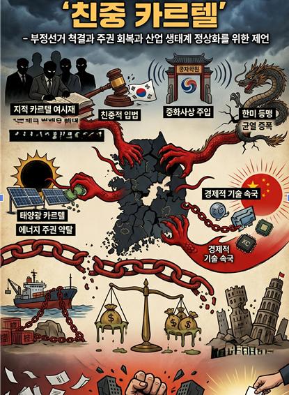 대한민국의 주권을 회복하고 안보 무결성을 되찾는 유일한 길은 국가의 운영체계와 생명력을 잠식한 친중 카르텔의 해체다. 우리 사회의 혈관 속에 깊숙이 침투한 중국산 디지털 정보와 핵심 산업의 거머리들을 이제는 직시하고 배척해야 한다.