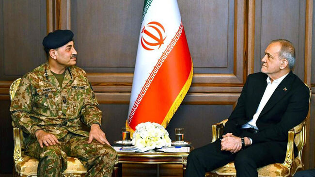 파키스탄 국방참모총장 겸 육군참모총장인 사이드 아심 무니르 원수는 이란 대통령 마수드 페제시키안 박사와 테헤란에서 중요한 회담을 가졌다. 2026.4.18. [파키스탄 프레스 인터내셔널/로이터]