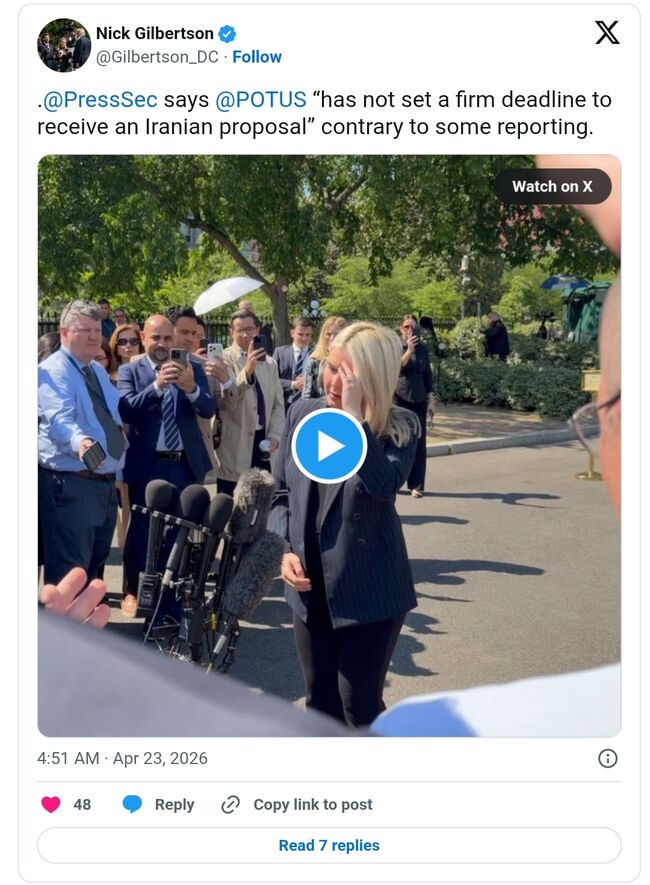일부 언론은 익명의 소식통을 인용해 대통령이 3~5일 연장을 고려하고 있다고 보도했는데, 캐롤라인 레빗 백악관 대변인은 22일(수) 오후 기자들에게 트럼프 대통령이 "이란의 제안을 받는 데 확정적인 시한을 정하지 않았다"고 밝혔다.
