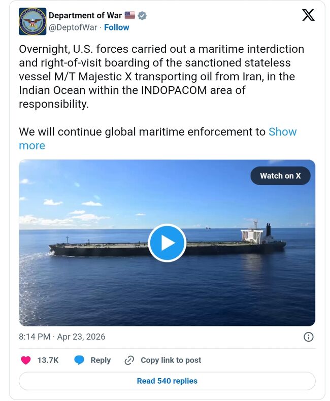 전쟁부는 "하룻밤 사이에, 미군은 이란에서 석유를 운송 중인 제재 대상 무국적 선박 M/T 머제스틱 엑스(Majestic X)를 인도양 내 인도태평양사령부 책임 구역에서 해상 차단 및 승선 검사를 실시했다"고 발표했다.