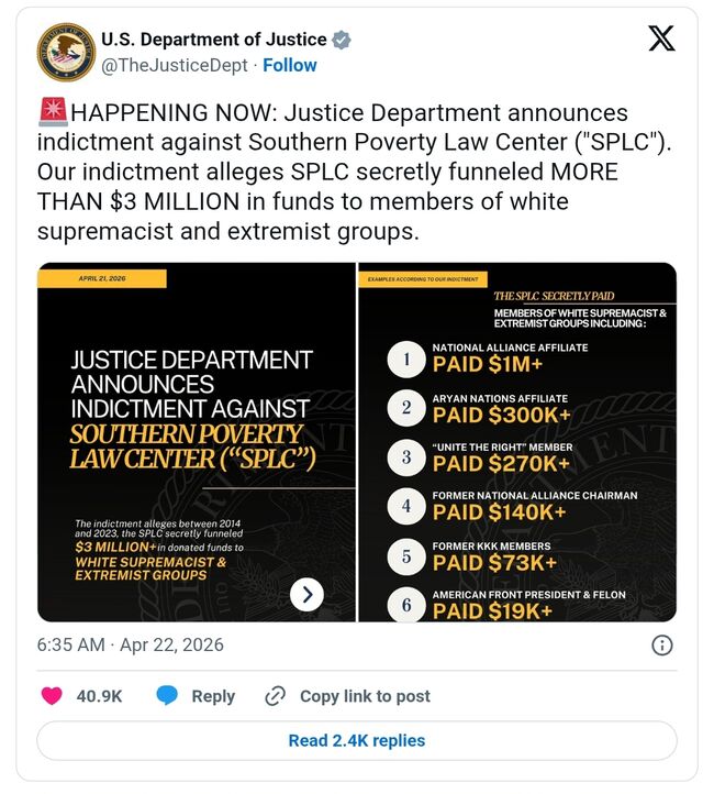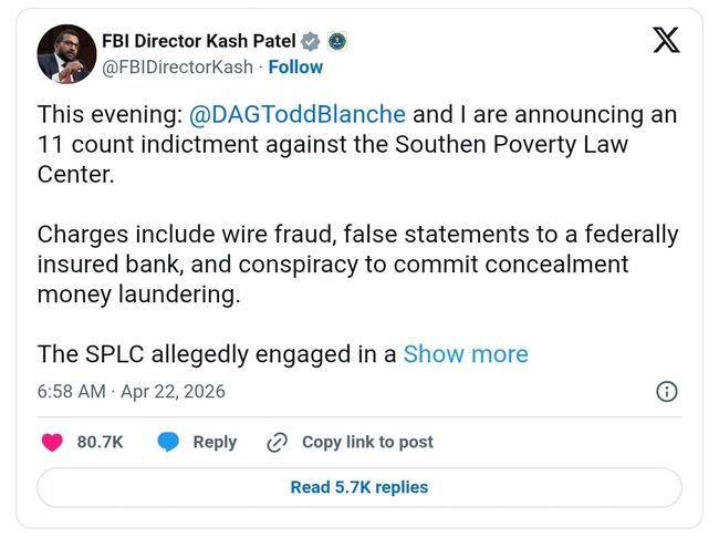 캐시 파텔 FBI국장은 21일(화) 엑스(X)에 "남부빈곤법센터(SPLC)는 기부자들을 속이고, 자신들의 배를 불리며, 이러한 기만 행위를 대중에게 숨기기 위해 대규모 사기 행각을 벌인 혐의를 받고 있다"면서 "그들은 폭력적인 극단주의 단체들을 해체하겠다고 기부자들에게 거짓말을 했지만, 실제로는 바로 그 극단주의 단체들의 지도자들에게 자금을 지원했고, 심지어 그 자금을 이용해 이들이 주 및 연방 범죄를 저지르도록 사주했다. 이는 불법 행위이며, 관련된 모든 개인에 대한 조사가 진행 중이다."라고 썼다.
