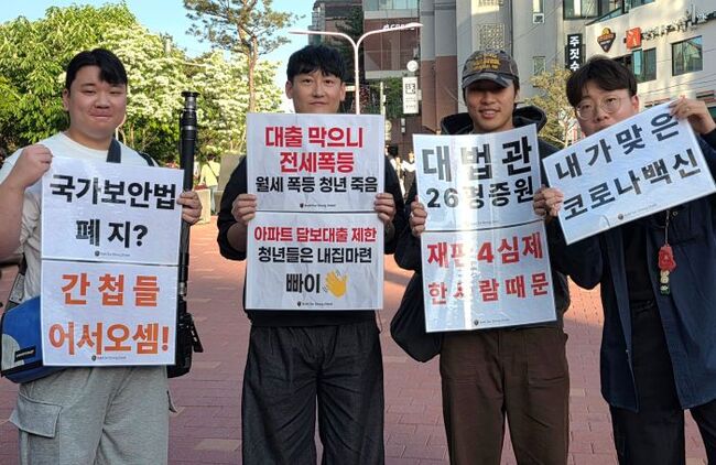 집회에 참가하는 청년들은 이 피켓을 그냥 들고만 있는 게 아니라 행인과 관광객이 잘 볼 수 있도록 인도 쪽을 향해 들어 보인다. 한 사람이라도 더 봐주었으면 하는, 애절한 마음이 전달됐는지 행인들도 ‘파이팅!’을 외치며 화답을 해준다.